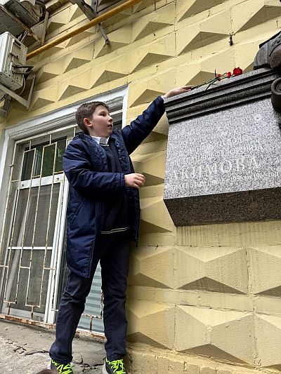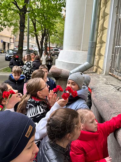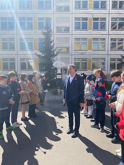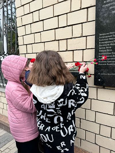 Ребята возложили цветы к мемориальным доскам, расположенным рядом со школой. Ученики из 9В удостоились чести поучаствовать в торжественной церемонии возложения цветов к мемориальной доске генерал-полковника М.С. Шумилова, расположенной на Ленинградском проспекте , 75 к.1. А 5В - традиционно к мемориальной доске на Дубосековской улице, посвященной героям-панфиловцам и на Волоколамском шоссе, 8, посвященной летчице А.Ф. Акимовой На ул. Врубеля состоялось возложение цветов к бюсту Ю. Н. Зыкова учащимися 4Б класса. Даниил Н. рассказал о подвигах героя СССР Ю. Н. Зыкова, а также историю его семьи.